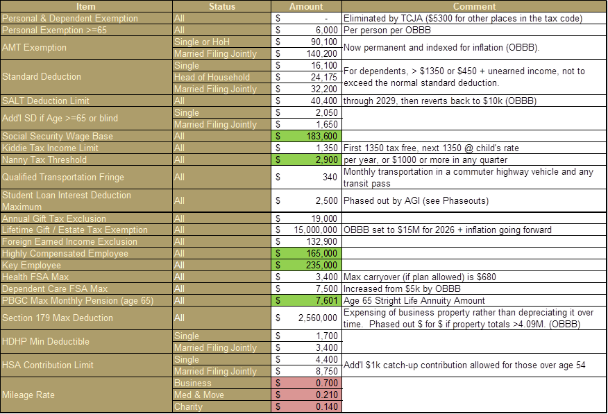 (red indicates not yet updated from 2025, green indicates updated with projected amounts but not finalized)